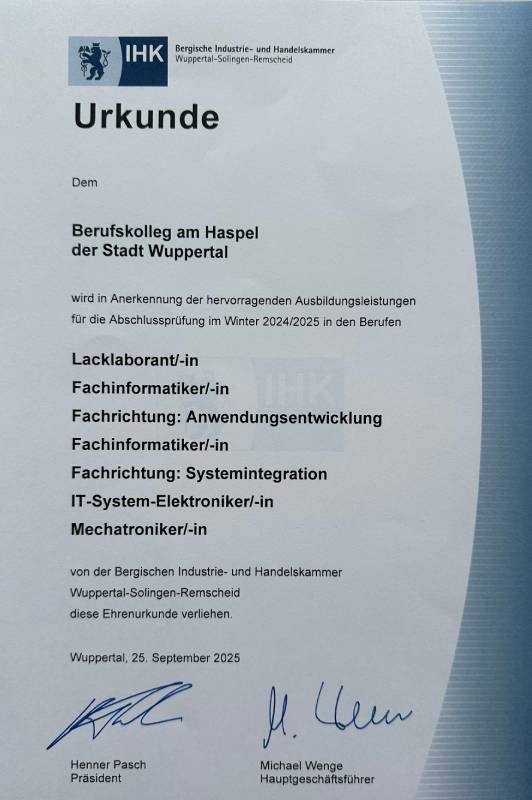 Am Donnerstag, den 25.09.25 hatte die Bergische IHK alle Azubis mit der Note „sehr gut“ zur Bestenehrung eingeladen. Aus dem Städtedreieck Wuppertal, Solingen und Remscheid wurden 117 ehemalige Azubis geehrt. 24 davon hatten ihre berufsschulische Ausbildung am Berufskolleg am Haspel absolviert. Damit stellt unsere Schule 20,5 % aller Absolventen mit der Bestnote. Sie kommen aus den Bereichen Chemie, Elektrotechnik und Informatik und sind verteilt über 10 verschiedene Ausbildungsberufe.