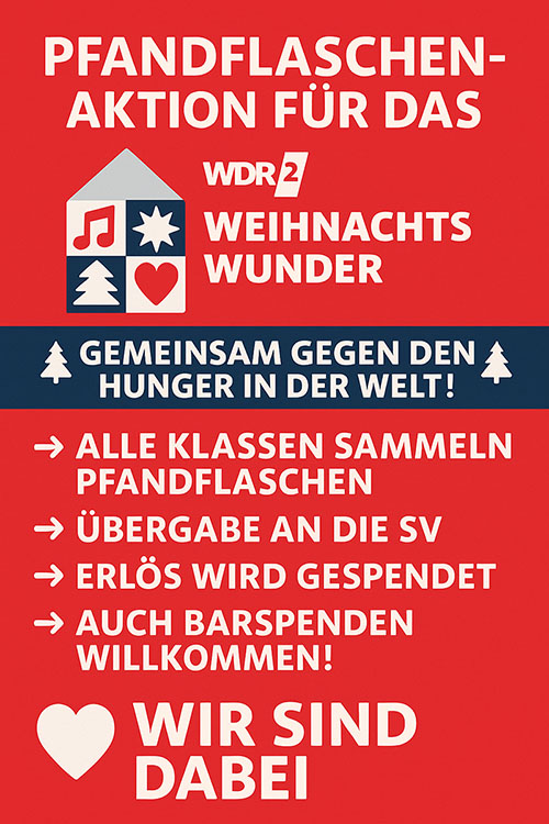 Wir freuen uns, euch mitteilen zu können, dass unsere Schule in diesem Jahr beim "WDR 2 Weihnachtswunder" mitmacht! Unter dem Motto „Gemeinsam gegen den Hunger in der Welt“ wollen wir Pfandflaschen und Geldspenden sammeln. Nur durch eure Unterstützung können wir gemeinsam was erreichen!