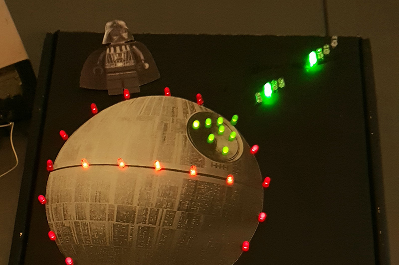 Dazu wurden jahrgangsübergreifende Teams gebildet, die in ihren Gruppen eine elektrotechnische Schaltung der maximalen Größe von 30 cm x 30 cm x 30 cm in Form eines Sternenhimmels planen und bauen mussten.
